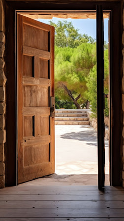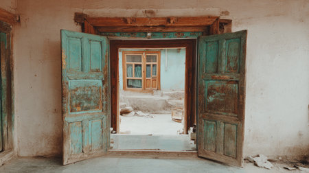 An open doorway reveals a glimpse into a rustic interior, featuring aged wooden frames and turquoise doors. The composition emphasizes lines and perspective, highlighted by natural light. This architectural detail conveys a sense of history and invitation, suitable for commercial projects or editorial applications.