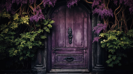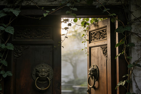 A stunning vintage wooden door featuring ornate details and surrounded by lush greenery. The architectural beauty captures a timeless charm and serene atmosphere.