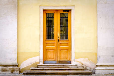 Old door on the yellow wall in Lisbon, Portugal, Europe.