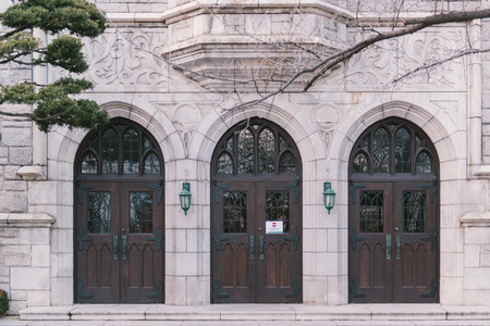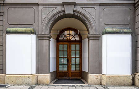 Two brown entrance doors with large glass panes and bars in the arches between the columns.