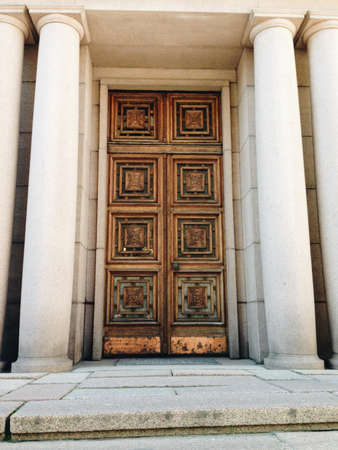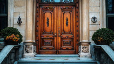 A beautiful entrance showcasing a wooden door framed by classic columns, illuminated by soft sunlight. Ideal for design and architecture themes.