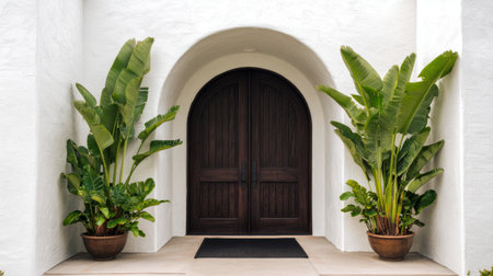 Front exterior with arched dark wood doors and tropical banana plants on both sides, smooth white stucco wall, simple black doormat, symmetrical composition, serene tropical aesthetic
