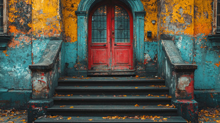 A vibrant rustic red door set in weathered walls, surrounded by scattered golden autumn leaves, evoking a nostalgic and charming atmosphere.