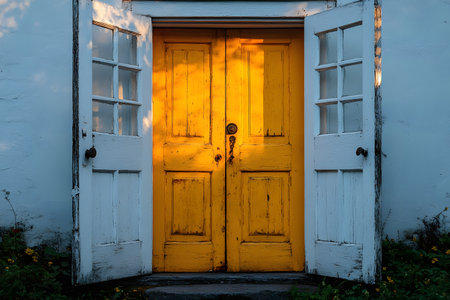 A charming rustic yellow door flanked by open white-framed doors, basking in warm sunlight. surrounded by a lush garden, this vintage entrance captures a sense of welcoming and timeless design, ideal for home decor inspiration. Generative AI