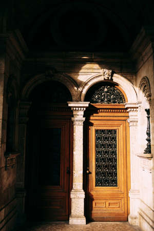 Old-world charm captured through the intricate design of wooden doors on a textured brick fa
