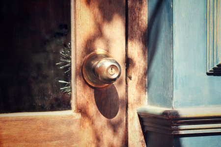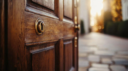This image captures the beauty of a wooden door with a brass knob, inviting viewers into the warm glow of a sunset, emphasizing texture and detail.