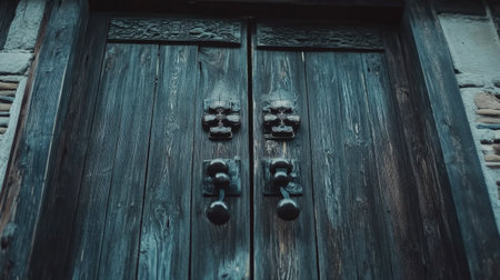 Close-up view of a rustic wooden door featuring antique hardware. This vintage entryway captures the charm of traditional architecture and craftsmanship.