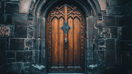 A beautifully crafted wooden door with intricate details, set against a rustic stone wall. This image captures the charm of vintage architecture and invites exploration.