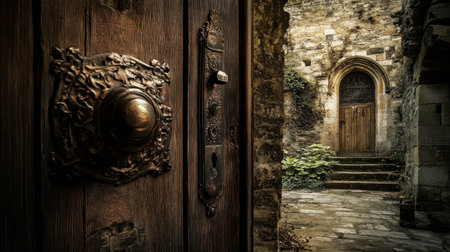 A captivating antique door handle leads to a historic architectural scene. The rustic textures and natural surroundings create an inviting ambience and sense of mystery.