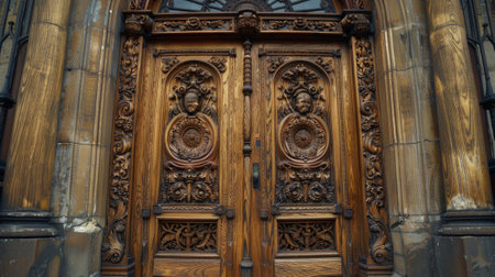 Captivating view of an ornate wooden door adorned with elegant carvings and shining golden handles, reflecting rich architectural heritage and craftsmanship.