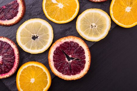 Creative arrangement of slices of citrus fruits on black painted surface. Top view with copy space.
