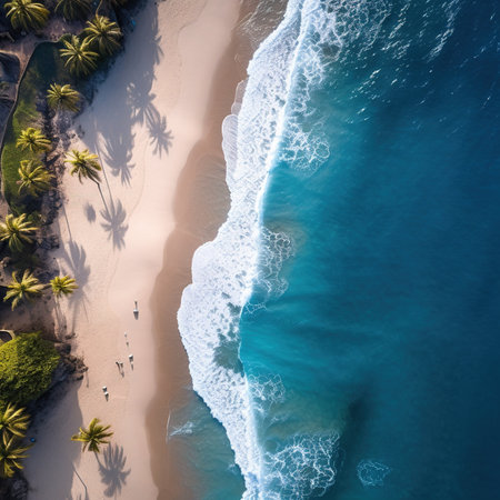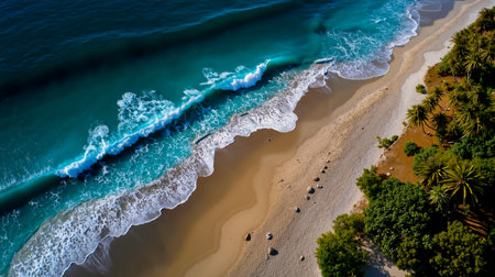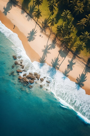 A stunning aerial view of a serene tropical beach featuring gentle waves lapping against the shore, lined with lush palm trees under the warm sun. Perfect for travel and relaxation themes.