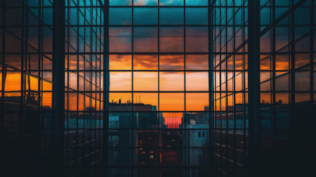 Golden sunrise shines through modern office windows overlooking urban city skyline with high rise buildings in early morning.