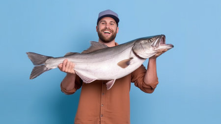 Celebrating the Catch: Joyful Fisherwoman Triumphantly Displays Her Bountiful Prize amid a Vibrant Blue Backdrop