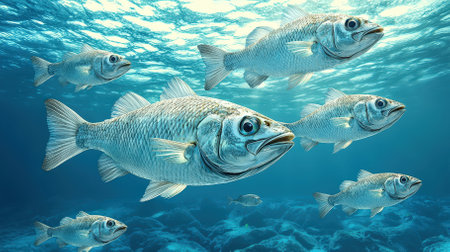 A school of fish gracefully swims through the clear blue waters, showcasing the beauty and serenity of marine life. Captivating underwater scene.