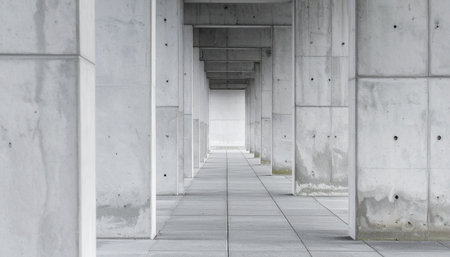 Brutalist concrete columns receding to infinity, with one flat panel in perfect focus