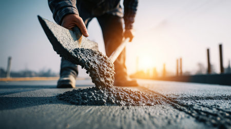 A construction worker is shown pouring wet concrete onto a road surface using a trowel. The image displays the process with close-up focus on the materials and action. The sunlight illuminates the scene suggesting an outdoor setting. The image is suitable for various commercial purposes.