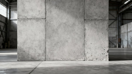 Close up view of rough, speckled concrete modular blocks occupying the foreground, contrasted against the expansive, dark interior of an industrial facility lit dramatically by high side windows.