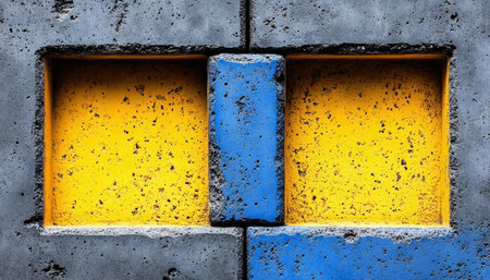 A close-up view of a concrete wall with two yellow recessed squares separated by a blue brick.