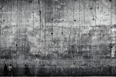 A black and white depiction of a solid concrete wall with various textures and patterns, creating a stark and industrial atmosphere.