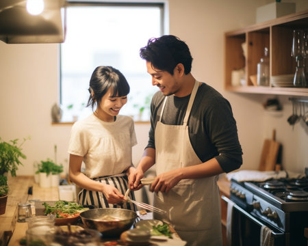 Generative AI : Attractive young asian couple or student looking at recipe and enjoy cooking food in kitchen at home Man and woman in gen millennial happy lifestyle together with h
