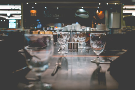 Interior of modern vintage restaurant in vintage tone, Empty glasses set on the table.