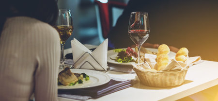Good food and tasty red wine in a restaurant during lunch time