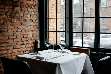 Elegant restaurant table for two in Montreal with natural light and chic brick wall ambiance