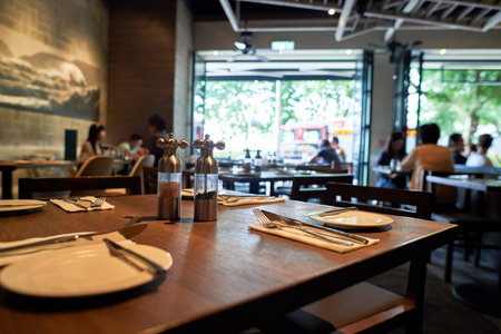 Wooden table with napkins and condiments at completely empty rustic restaurant with now people and customers during covid 19 corona virus pandemic shut down.