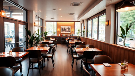 Interior of a modern restaurant with tables and chairs, nobody inside