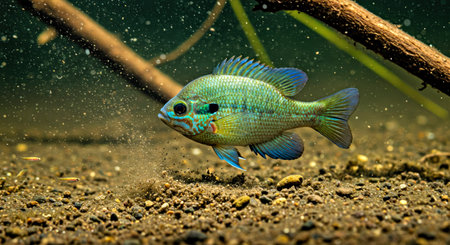A fish swimming freely through a rocky and gravely aquatic environment, capturing the natural texture and clarity of water with a focus on underwater life.