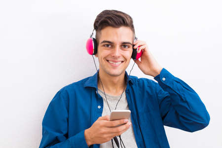 Young man listens to music with headphones. The beautiful boy dances and sings to the rhythm of the music.