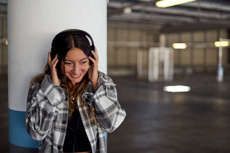 Woman listening to music with headphones. She is leaning against the column of a parking lot.