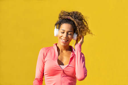 Portrait of young latin woman listening to music with headphones against yellow background. Urban concept.