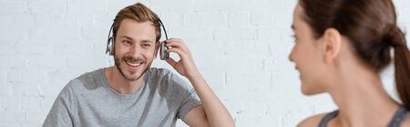selective focus of young woman looking at cheerful man in headphones, panoramic shot