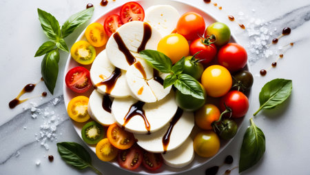 Delicious appetizer of sliced mozzarella cheese and colorful cherry tomatoes with fresh basil leaves and balsamic vinegar