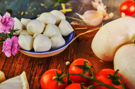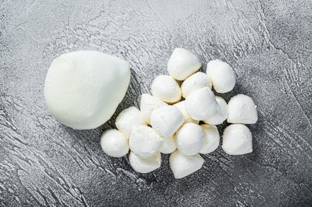Mozzarella cheese balls, fresh white mini slices as an ingredient for Mediterranean food. Mozzarella cheese as a background for your design