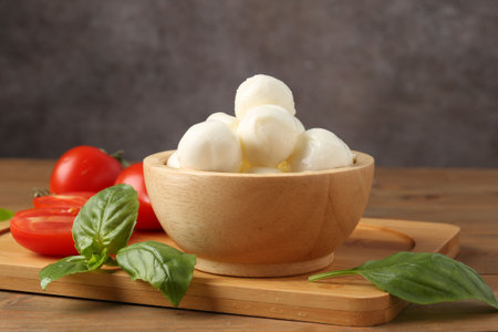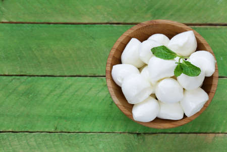 Mini mozzarella cheese in a wooden bowl