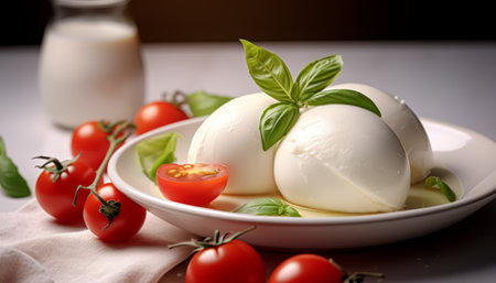 South Italian soft white mozzarella cheese made from buffalo cows milk served with ripe tomatoes and fresh green basil herb close up