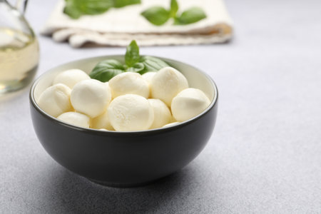 Tasty mozzarella cheese balls and basil on light grey table, closeup. Space for text