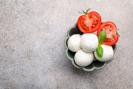 Top view of small balls mozzarella cheese and Cherry tomatoes with basil leaves as ingredients for vegetarians meals on gray concrete background with copy space