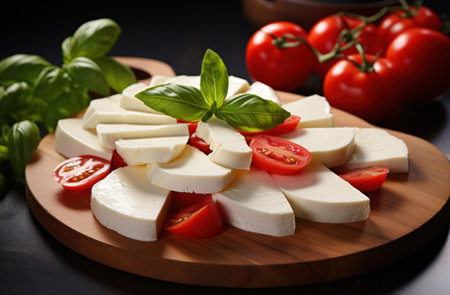 AI Generated. Mozzarella Cheese with Tomatoes and Basil on Slate for Culinary Use