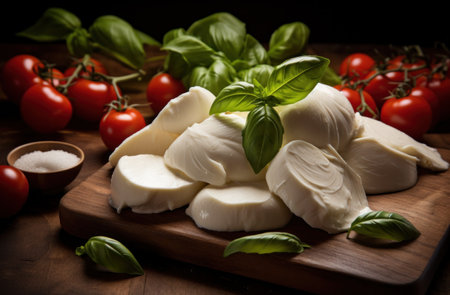 Cheese collection, soft white Italian mozzarella di bufala campana with fresh green basil leaves and red cherry tomatoes close up