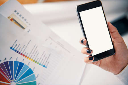 Mockup image of a smartphone with the blank white screen in a hand and stock chart on the background.