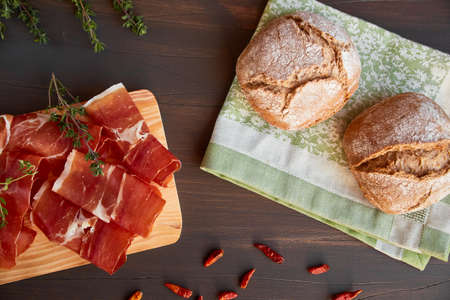 Fresh green thyme and hot red pepper. Succulend bacon on a wooden board. Freshly baked hand-made bread on a kitchen towel.