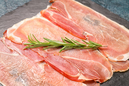 Spanish serrano ham slice on black slate background