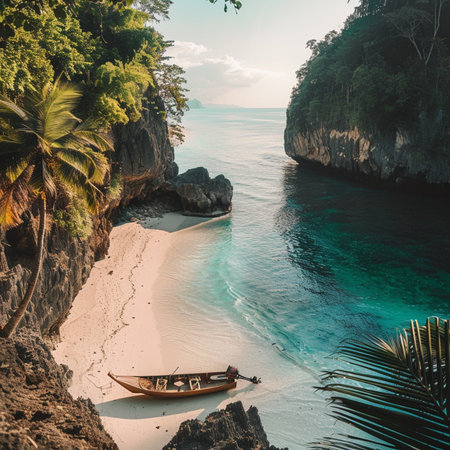 Discover a tranquil beach scene featuring a traditional boat resting on calm waters, surrounded by lush greenery and rugged cliffs, perfect for travel inspiration.