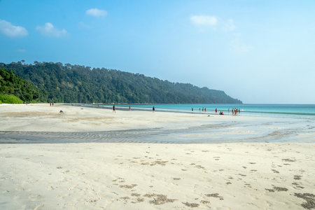 Indian tourists a large crowd resting on the most beautiful beach in Asia called Radhanagar Beach, Havelock, Andaman Islands, India. 18 January 2018
