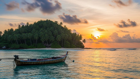 A traditional wooden longtail boat rests on turquoise water near a lush tropical island during a vibrant sunset.