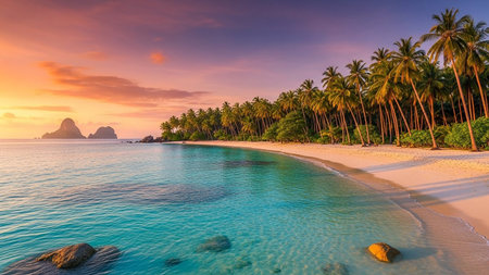 the serene panorama in thailand unfolds with a breathtaking stretch of white sand, captured on analog film to evoke a sense of nostalgia and warmth, transporting viewers to a tropical paradise where turquoise waters meet the horizon, surrounded by lush greenery and swaying palm trees. ai generated
